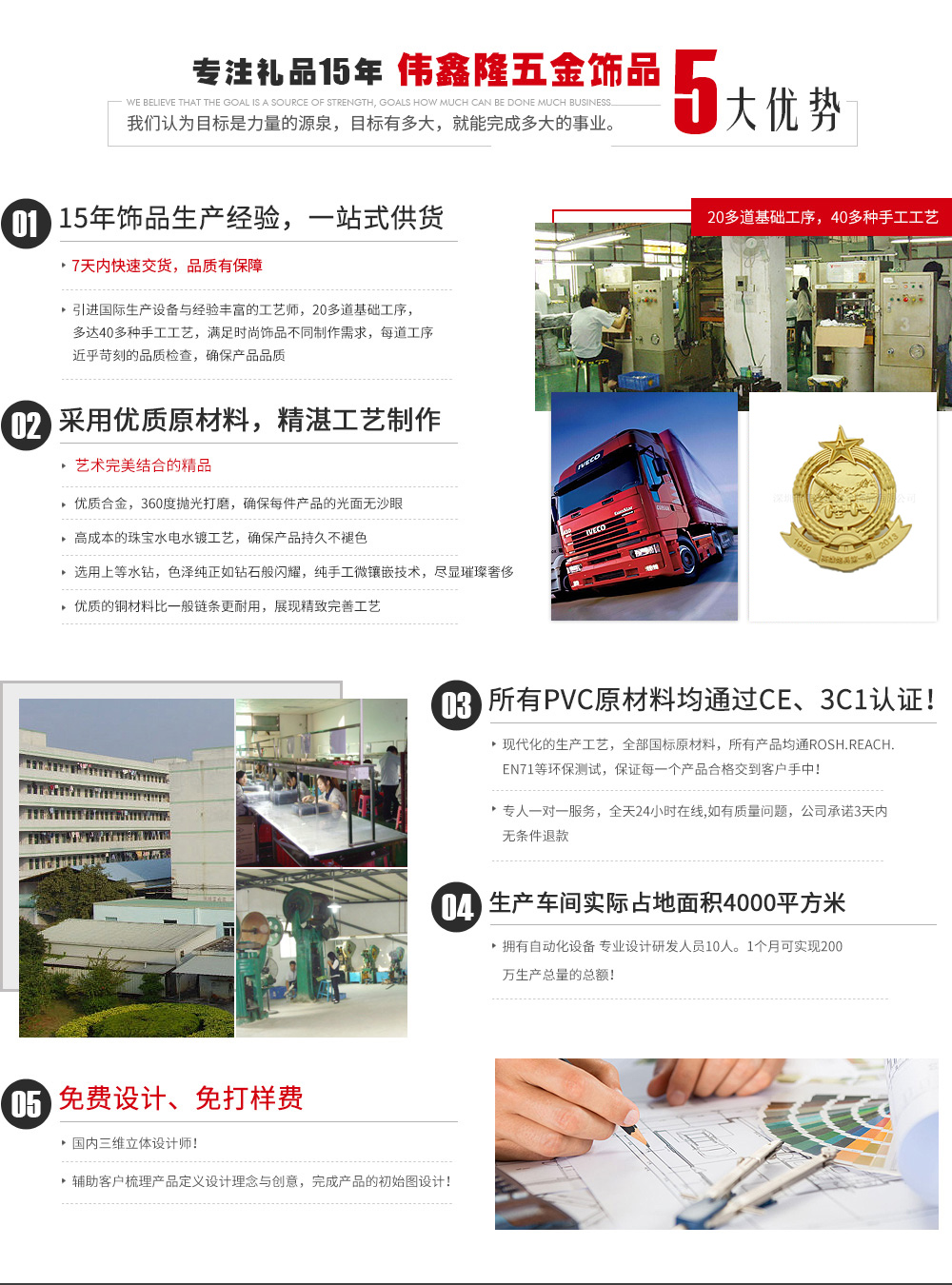 深圳市偉鑫隆五金飾品有限公司位于廣東省深圳市坑梓鎮(zhèn),是一家集設(shè)計(jì)、生產(chǎn)、銷售為一體的專業(yè)五金禮品工藝公司。 公司擁有經(jīng)驗(yàn)豐富的專業(yè)技術(shù)精英團(tuán)隊(duì),至今已有十多年設(shè)計(jì)生產(chǎn)經(jīng)驗(yàn)。 公司自有工廠引進(jìn)先進(jìn)的臺(tái)灣設(shè)備及技術(shù),擁有設(shè)計(jì)、繪圖、制模、沖壓、壓鑄、拋光、電鍍、包裝等生產(chǎn)流程,可生產(chǎn)銅、鐵、不銹鋼、鋁、鋅合金、鉛錫合金等材質(zhì)的金屬徽章、胸針、胸章、獎(jiǎng)?wù)?、?jiǎng)牌、金屬標(biāo)牌、工號(hào)牌、金屬鑰匙扣、狗牌、軍牌、開(kāi)瓶器、金屬手機(jī)吊飾、錢夾、領(lǐng)帶夾、帽夾、項(xiàng)鏈吊墜、掛包鉤、紀(jì)念章、紀(jì)念幣、袖扣、促銷禮品鑰匙扣、書(shū)簽、五金配件、開(kāi)瓶器等旅游紀(jì)念品及工藝禮品五金飾品。我公司還可根據(jù)客戶樣板開(kāi)模生產(chǎn)。 公司秉承“精...